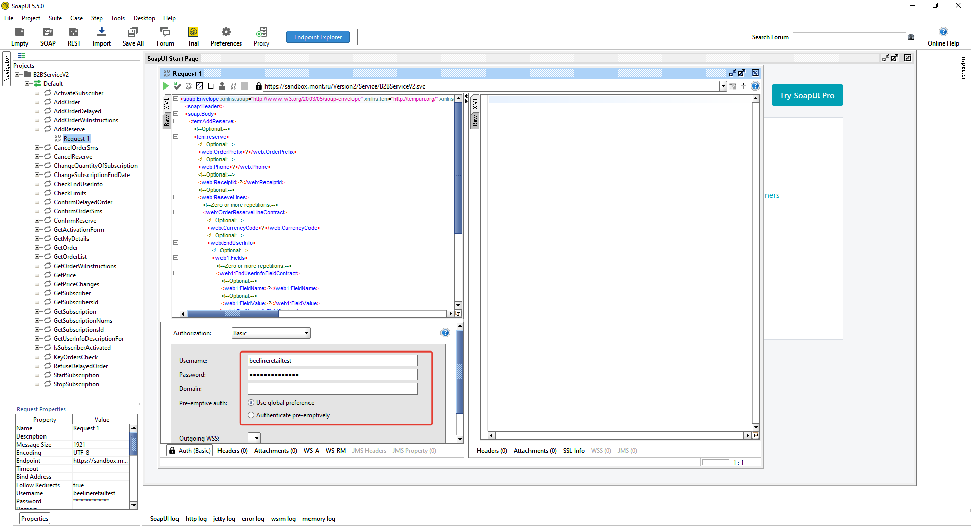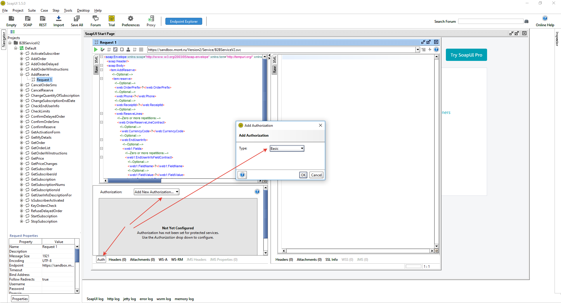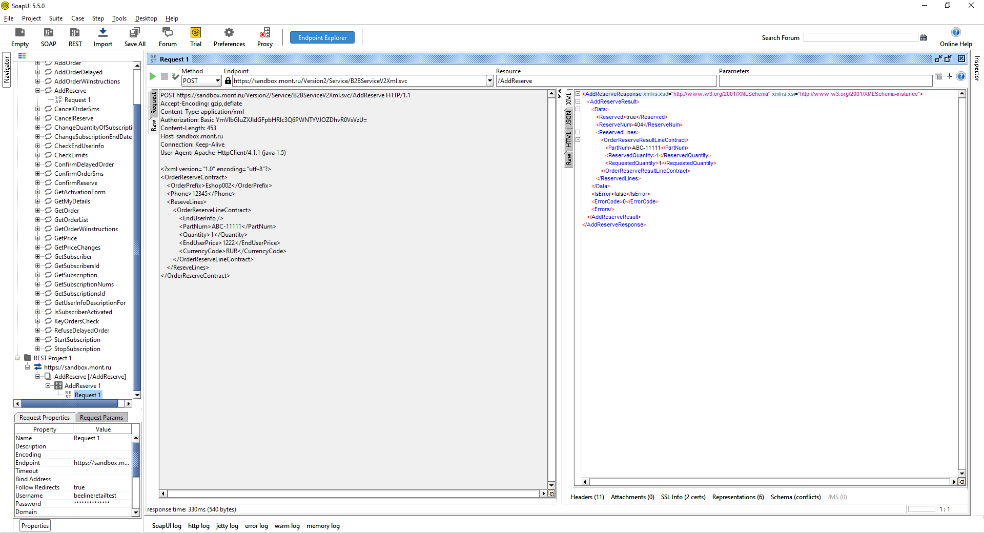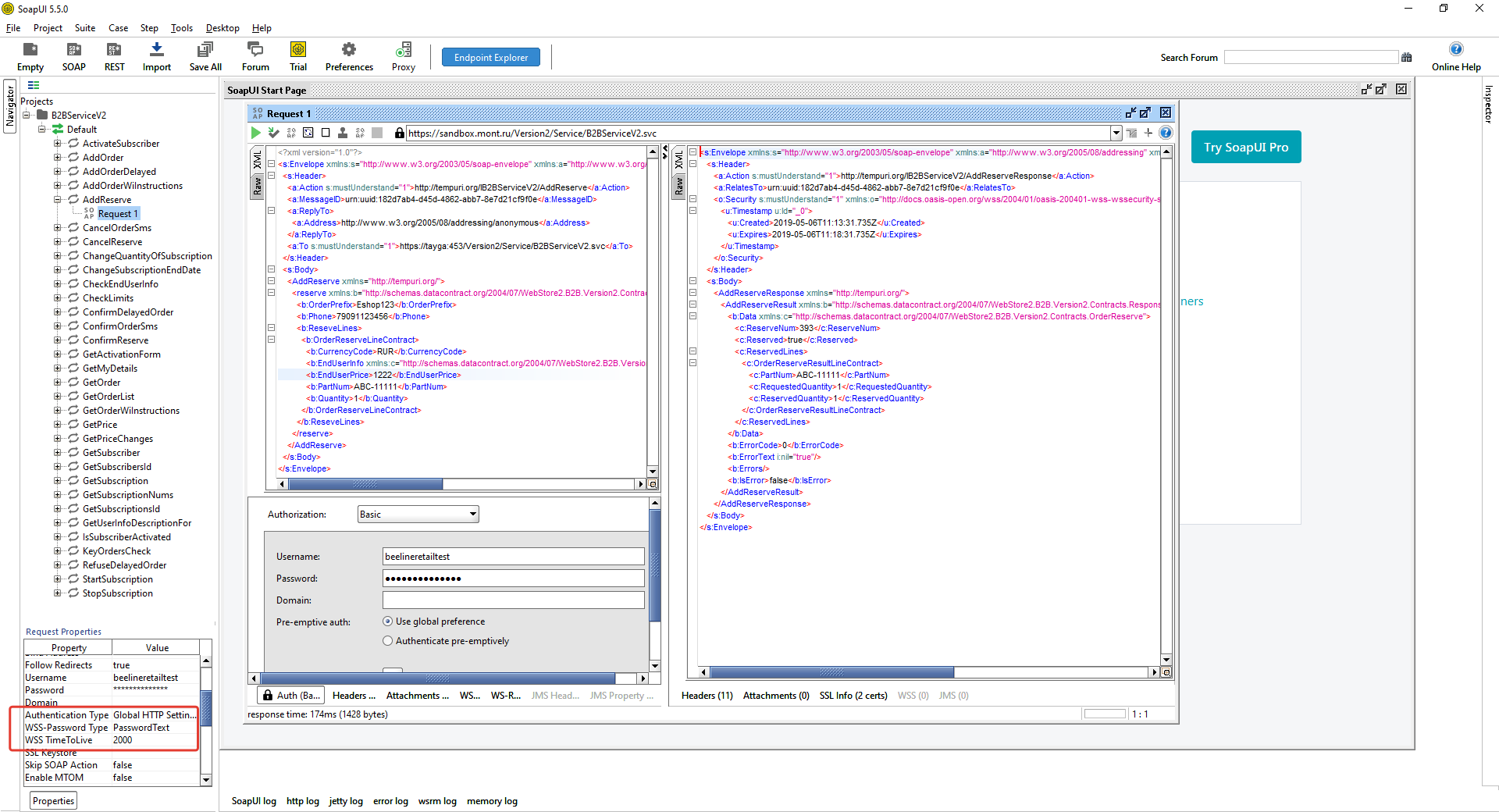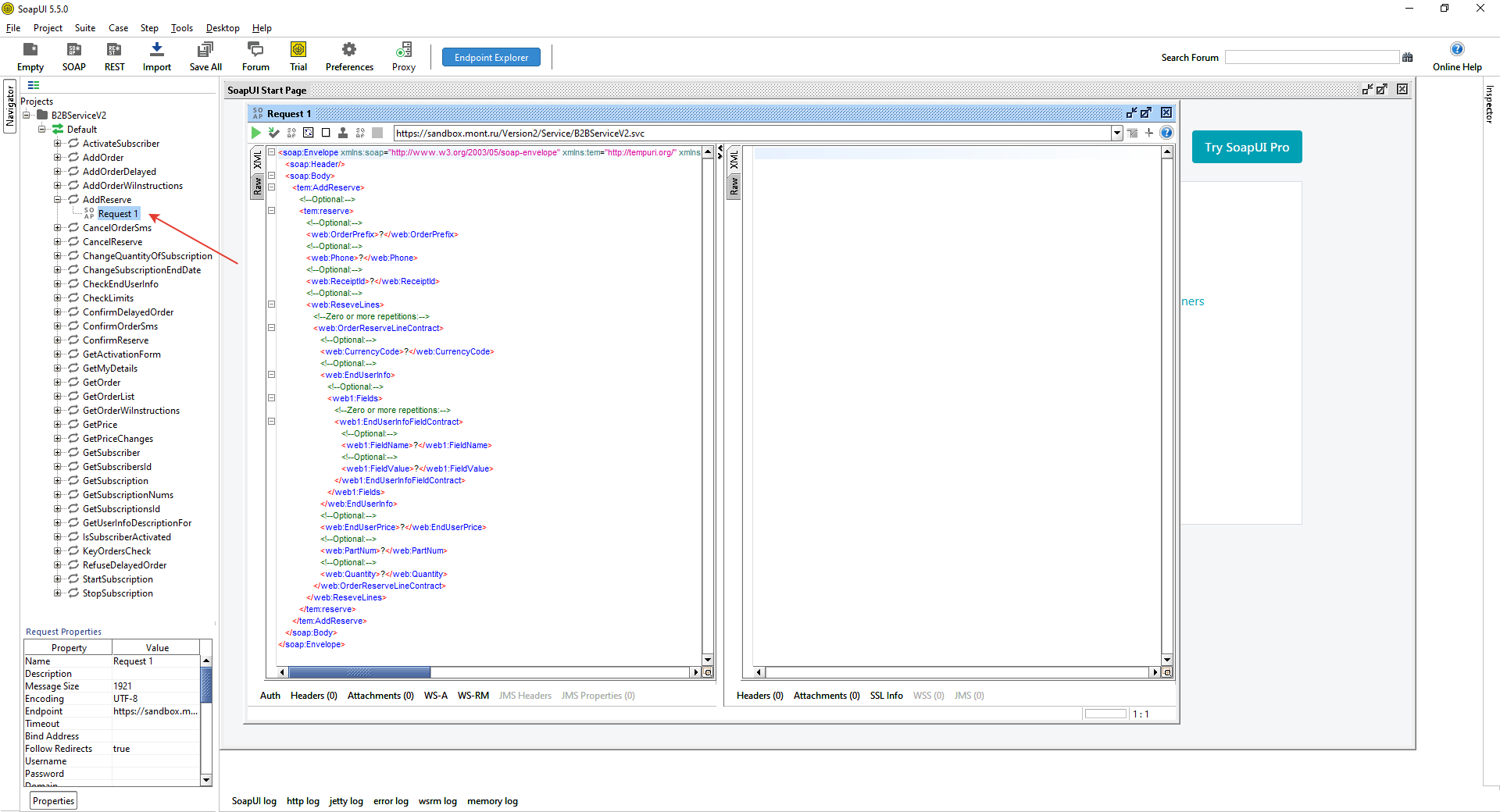 Method descriptions contain bodies of SOAP requests in the format used to send them to the server. You cannot re-run a request by simply copying and pasting its body from the description to SoapUI. Part of the body (Security) is formed dynamically. Below are the steps you need to take to configure SoapUI and form a valid request using the AddReserve method as an example.