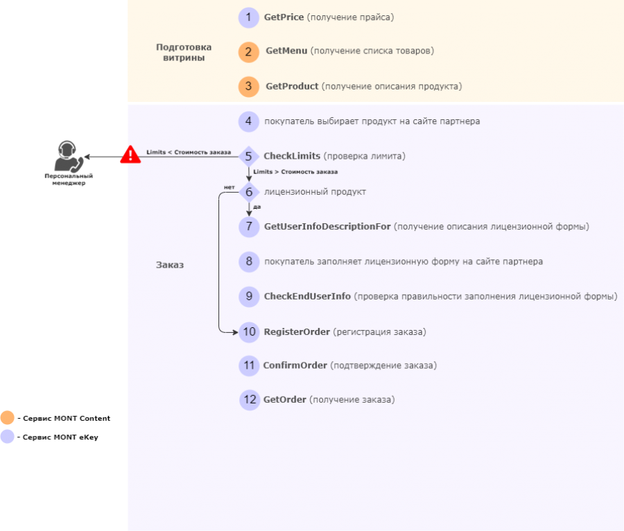 При проектировании своей системы партнер должен учитывать, что ключи/ссылки/файлы, заказанные через ESD - невозвратные, и после размещения заказ отменить уже не получится. Поэтому мы рекомендуем размещать заказ в систему MОНТ только после того, как конечный пользователь совершит оплату. Необходимость следования этой рекомендации определяется бизнес-процессами самого партнера.